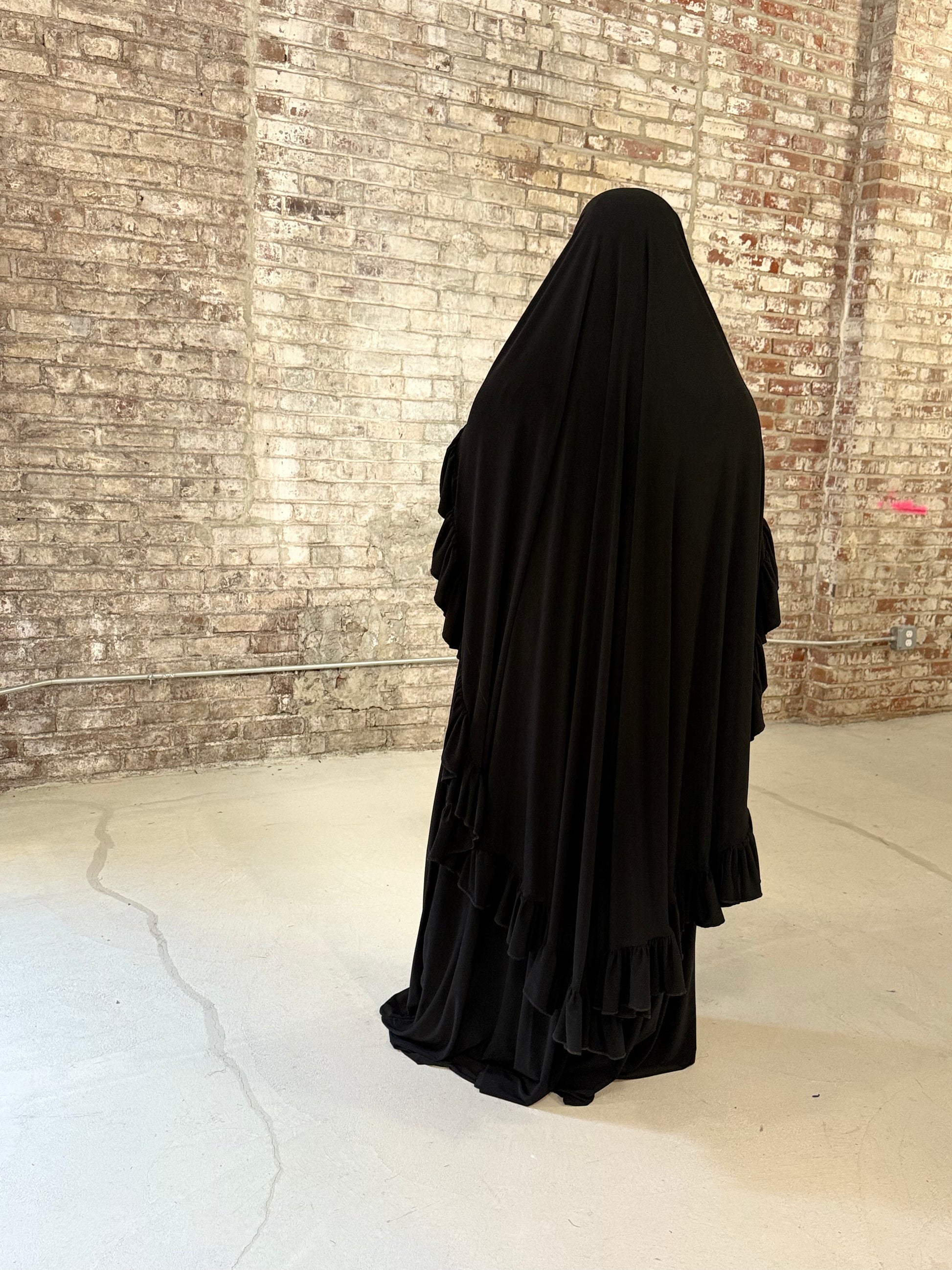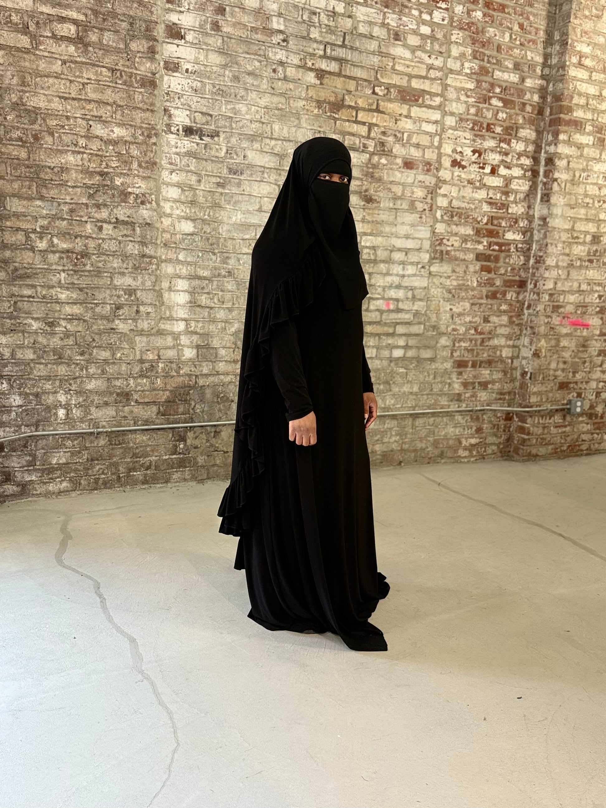 If you’re looking for a “NEW ONE PIECE” modest look, come shop our “MN AMIRAAH SET” paired with our 60” Bussstt Downnn with ruffles Attached.