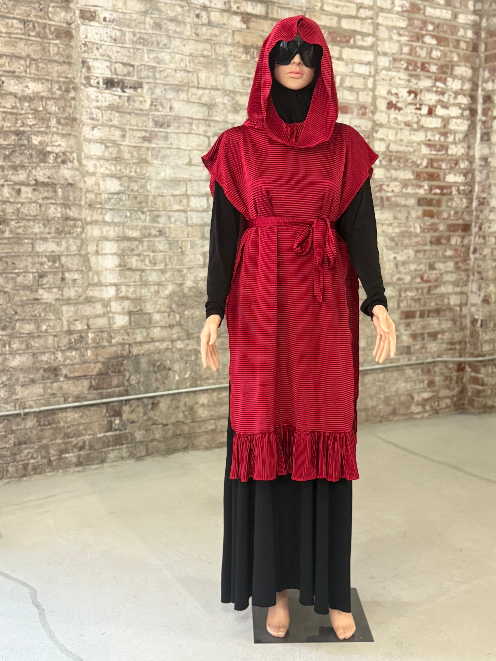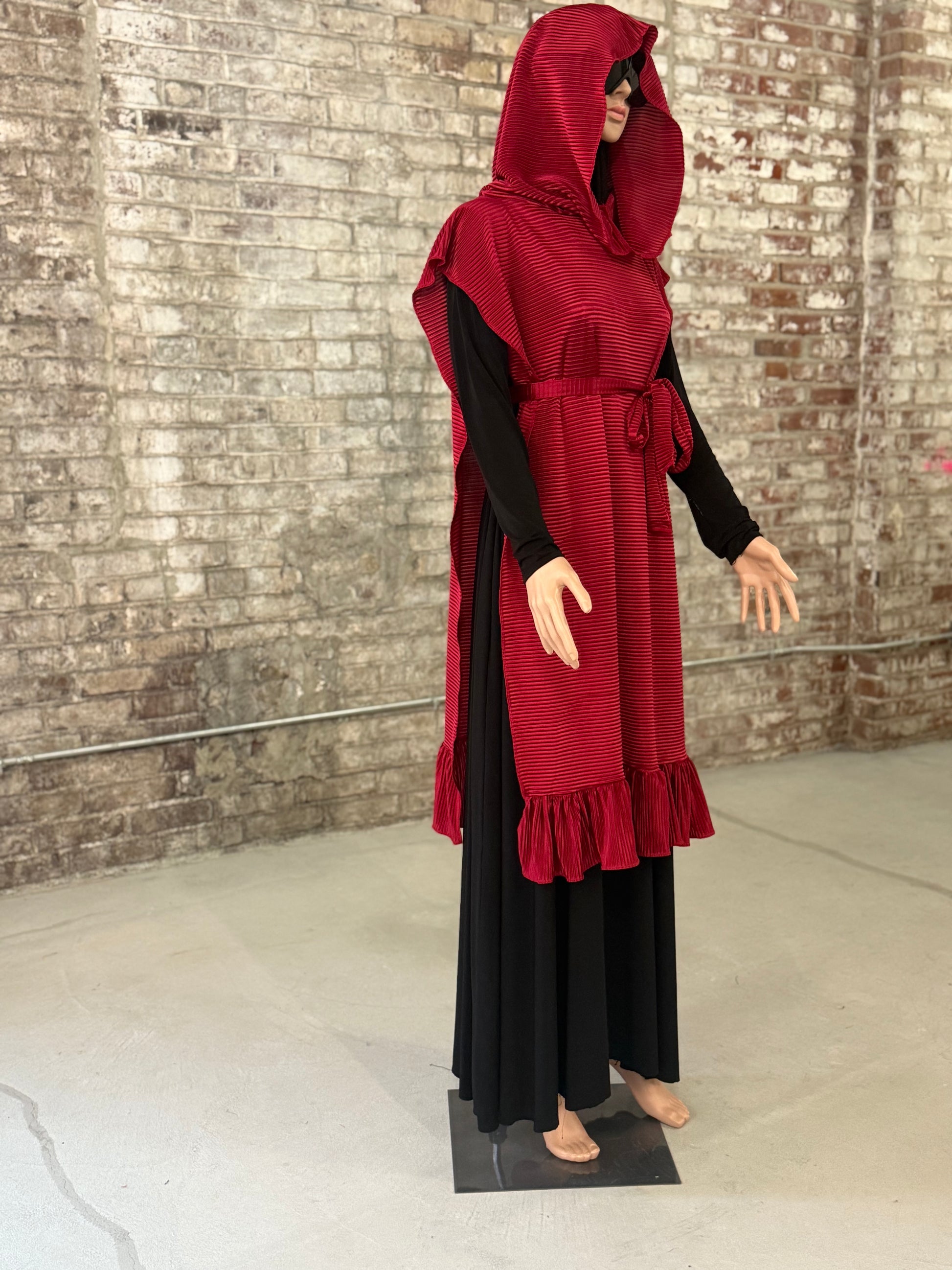This is our HADIYYAH Overlay that comes with ruffles attach on the bottom an oversized hood and belt. Our HADIYYAH OVERLAY can turn any plain garment into a fashion statement.